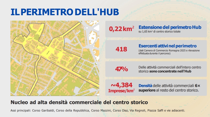 Il Comune di Forlì ha candidato ad Hub Urbano il cuore commerciale del centro storico comprendente gli assi principali e le vie a più alta intensità commerciale, caratterizzate da una pluralità di funzioni e da una forte presenza di attività economiche. (vedi Planimetria dell’area Hub)