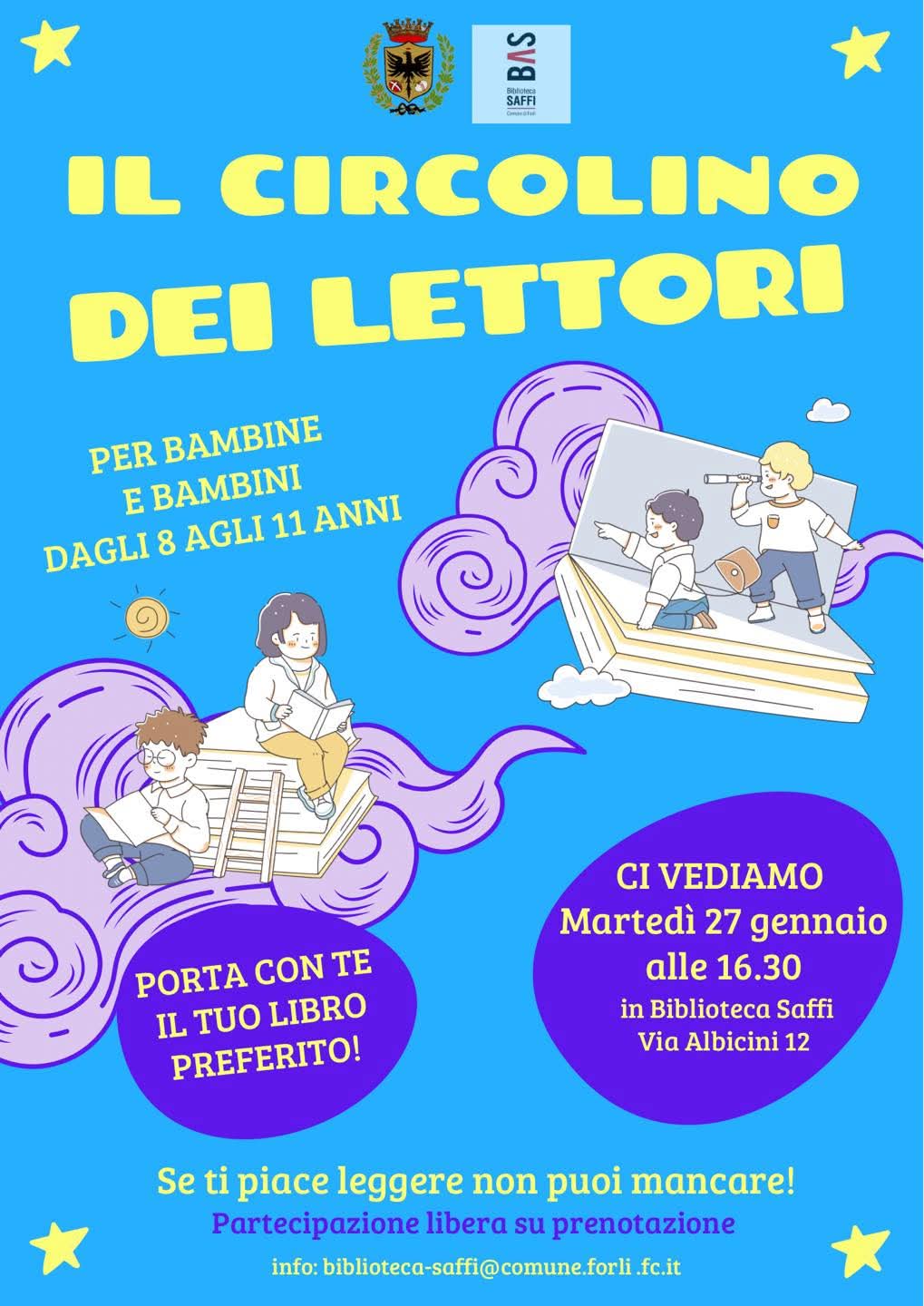 Alla Biblioteca Aurelio Saffi, presso Palazzo Romagnoli in via Albicini 12, nasce un nuovo Gruppo di lettura per bambine e bambini dagli 8 agli 11 anni che amano la lettura e vogliono condividere un pomeriggio all’insegna delle storie e della fantasia. Il primo appuntamento sarà martedì 27 gennaio alle ore 16.30 presso la Sala Ragazzi della Biblioteca Aurelio Saffi. Ogni bambino, per questo primo incontro, porterà il suo libro preferito per condividerlo con i suoi piccoli compagni di viaggio. Il Gruppo si incontrerà un martedì pomeriggio al mese per parlare di un libro letto a casa in autonomia e scelto insieme. Ogni appuntamento sarà facilitato dalle bibliotecarie della Saffi. La partecipazione al Gruppo è gratuita ma è richiesta l’iscrizione.