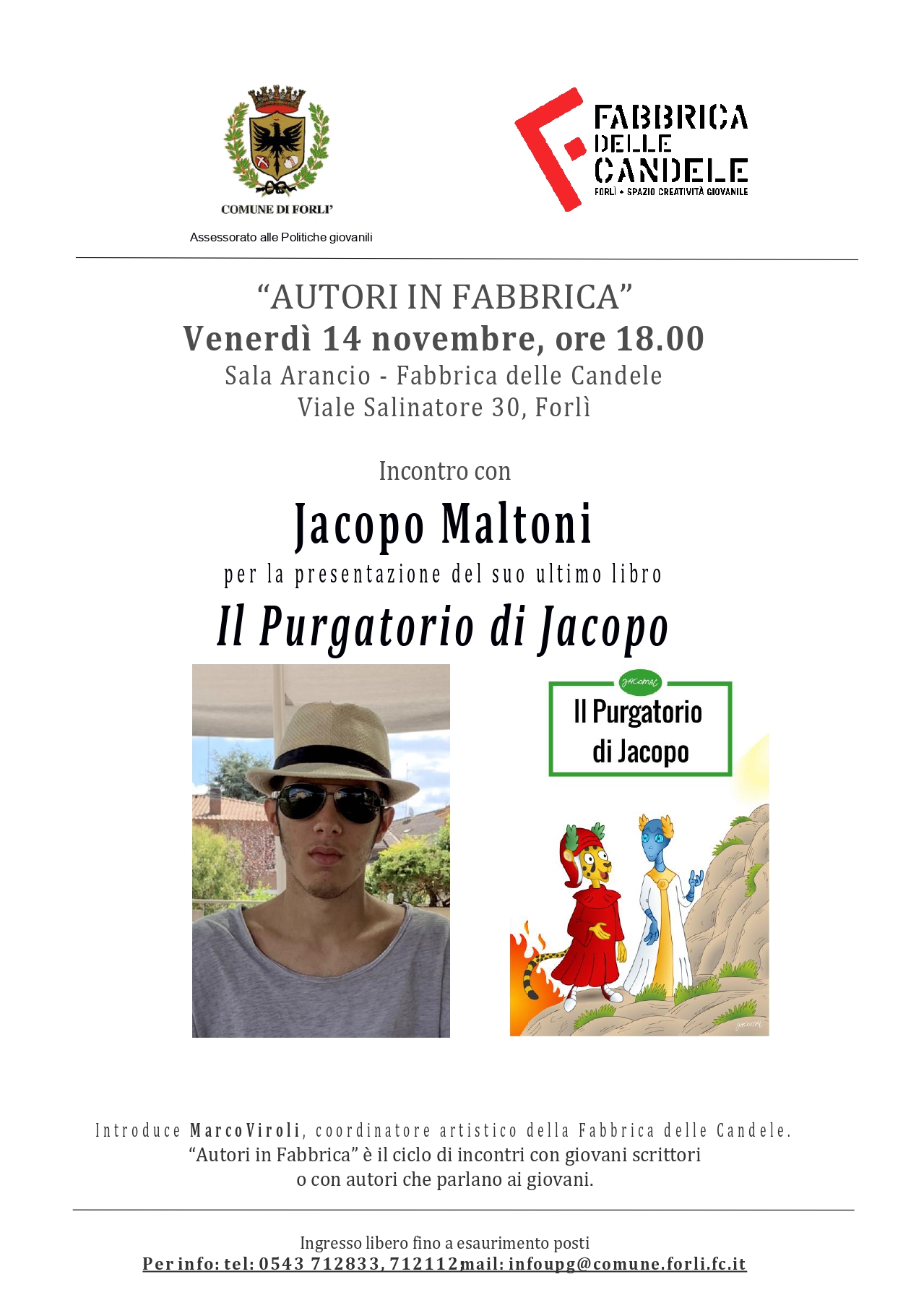 Venerdì 14 novembre, alle ore 18.00, presso la Sala Arancio, il giovane fumettista forlivese Jacopo Maltoni presenta Il Purgatorio di Jacopo, la sua più recente opera a fumetti ispirata alla seconda cantica della Divina Commedia.