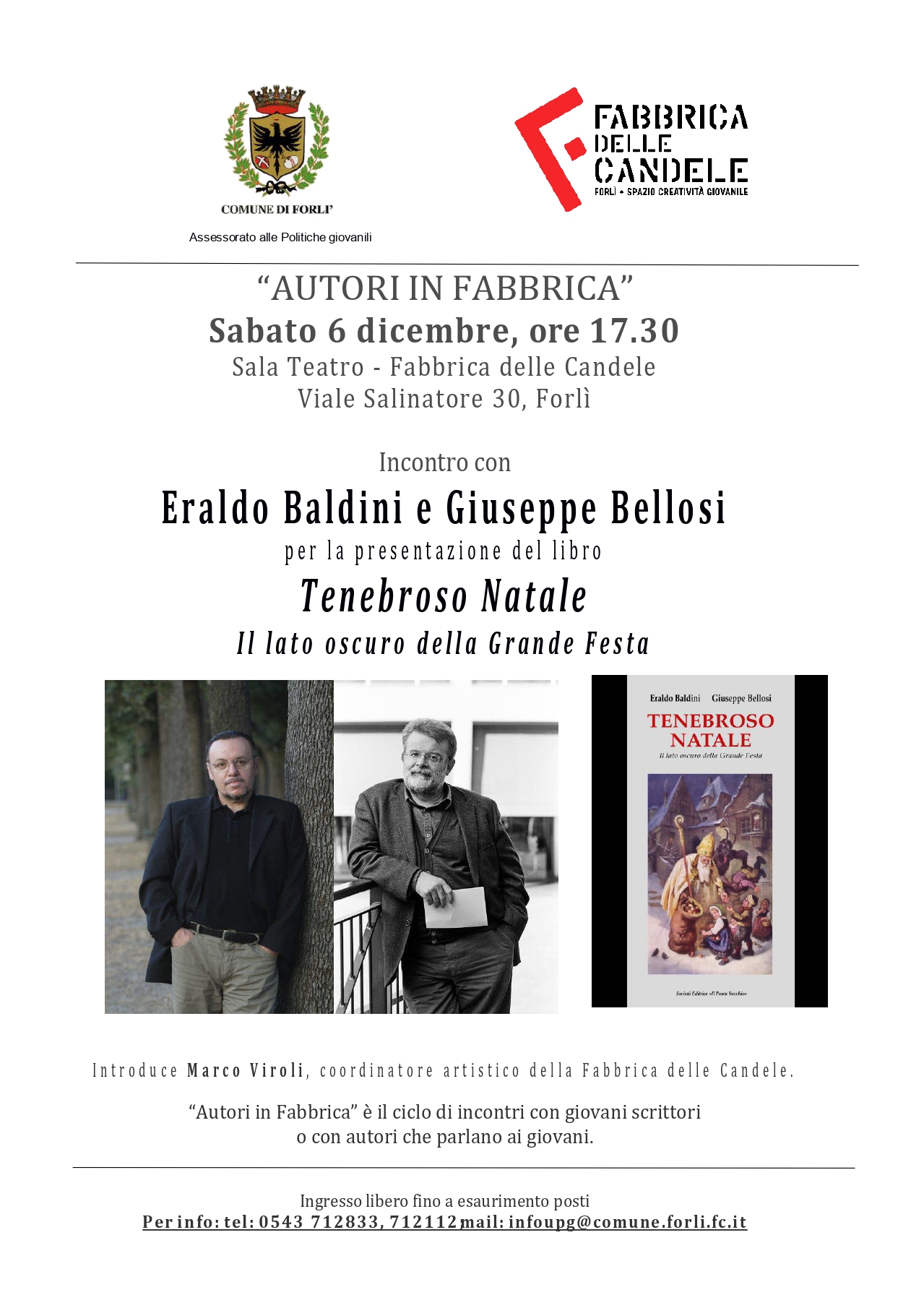 Sabato 6 dicembre, alle ore 17.00, la Sala Teatro della Fabbrica delle Candele ospiterà Eraldo Baldini e Giuseppe Bellosi, due tra le voci più autorevoli dell’antropologia e del folklore italiano, per la presentazione del loro volume “Tenebroso Natale”. A dialogare con gli autori sarà Marco Viroli, coordinatore artistico della Fabbrica delle Candele.