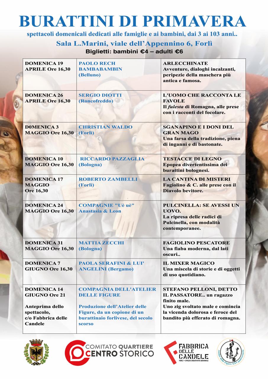 Nasce a grande richiesta la rassegna domenicale di spettacoli dal vivo “Burattini di Primavera”, rivolta ai ragazzi e alle famiglie, nella sala L. Marini, viale dell’Appennino n. 6. La rassegna propone per nove settimane, da domenica 19 aprile a domenica 14 giugno, spettacoli di artisti provenienti da ogni parte d’Italia. Si comincia domenica 19 aprile con Paolo Rech, valente burattinaio veneto, che presenta lo spettacolo “Arlecchinate”, un’ora di avventure, dialoghi incalzanti, peripezie della maschera più antica e famosa.