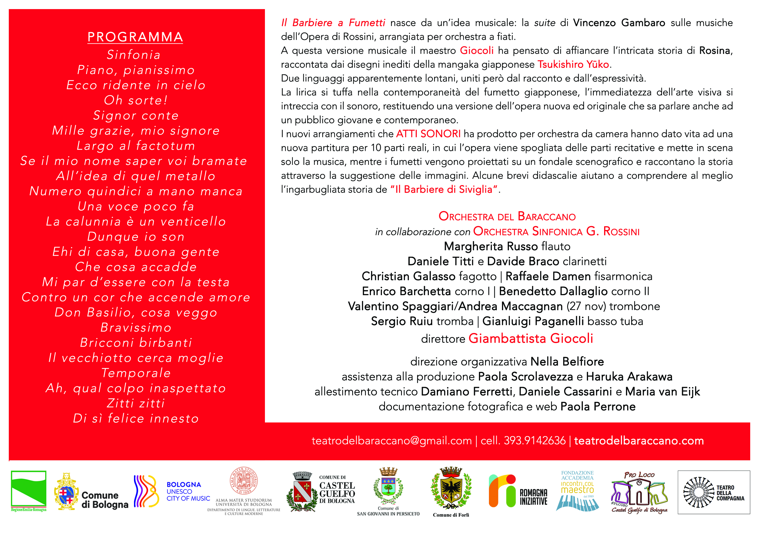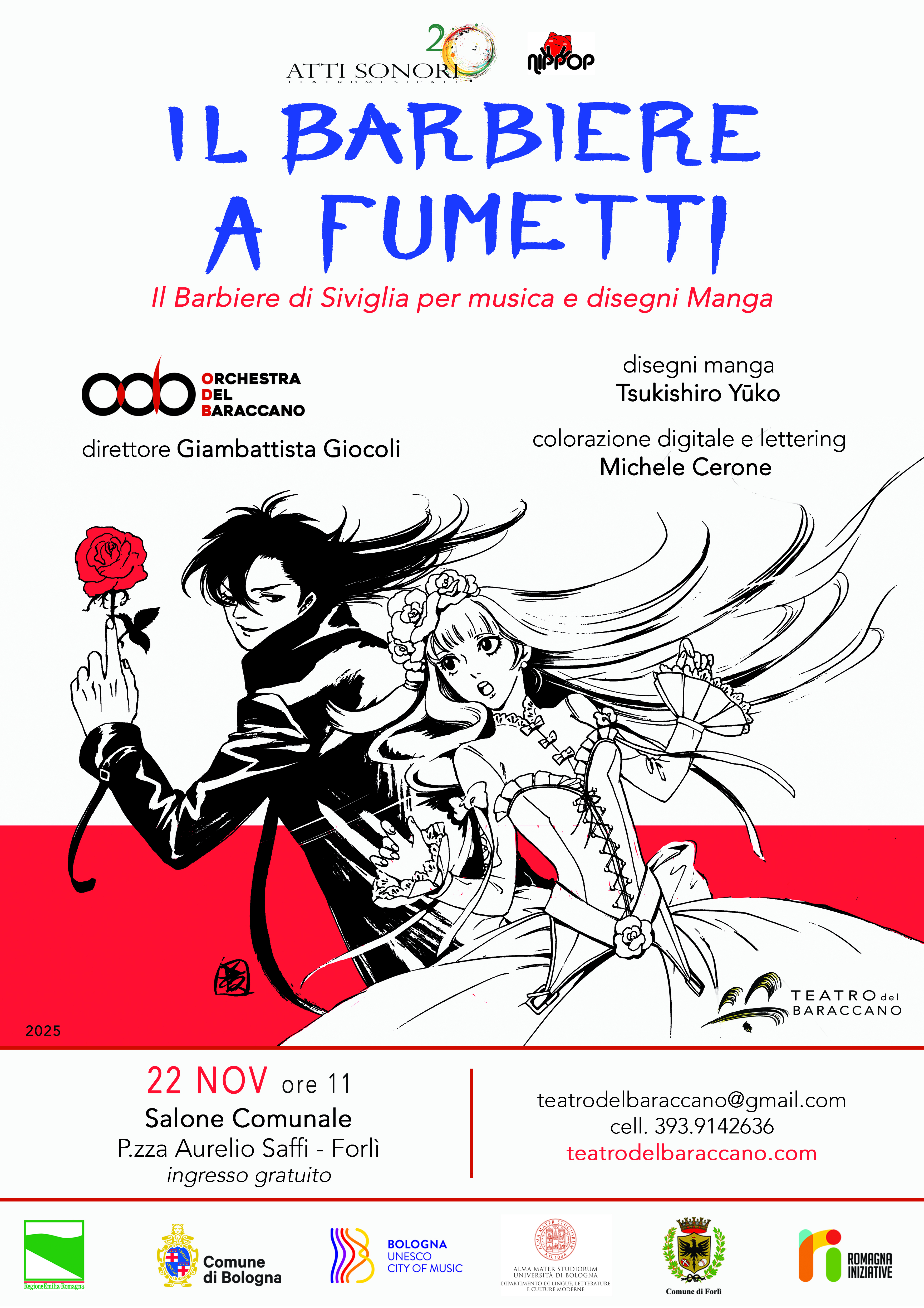 Lo spettacolo sarà in scena a Forlì sabato 22 novembre alle ore 11.00 nel Salone Comunale, ingresso da piazza Saffi 8, ed è parte della programmazione di “Atti sonori 2025”, la stagione del Teatro del Baraccano di Bologna giunta alla sua ventesima edizione. L’orchestra è diretta dal maestro Giambattista Giocoli, con suite di Vincenzo Gambaro sulle musiche dell’Opera di Rossini, arrangiata per orchestra a fiati e raccontata attraverso i disegni originali della mangaka giapponese Tsukishiro Yūko.